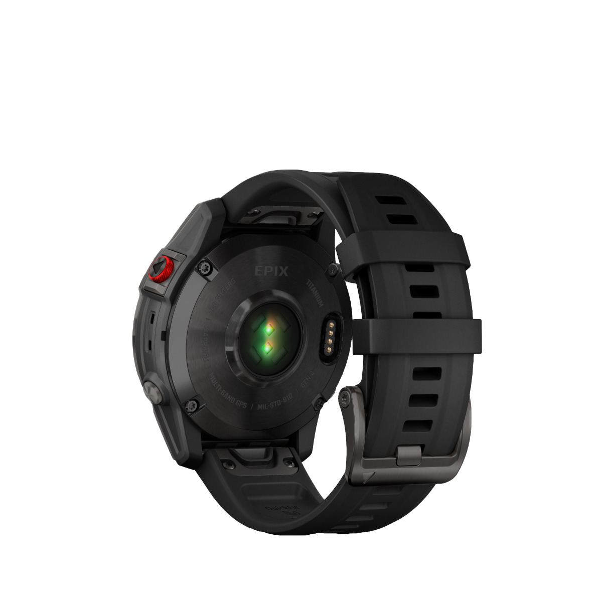 The Garmin Epix (Gen 2) features a rugged yet stylish design, suitable for both outdoor activities and everyday wear. The black titanium finish complements its robust build, ensuring that it remains lightweight and comfortable throughout the day.