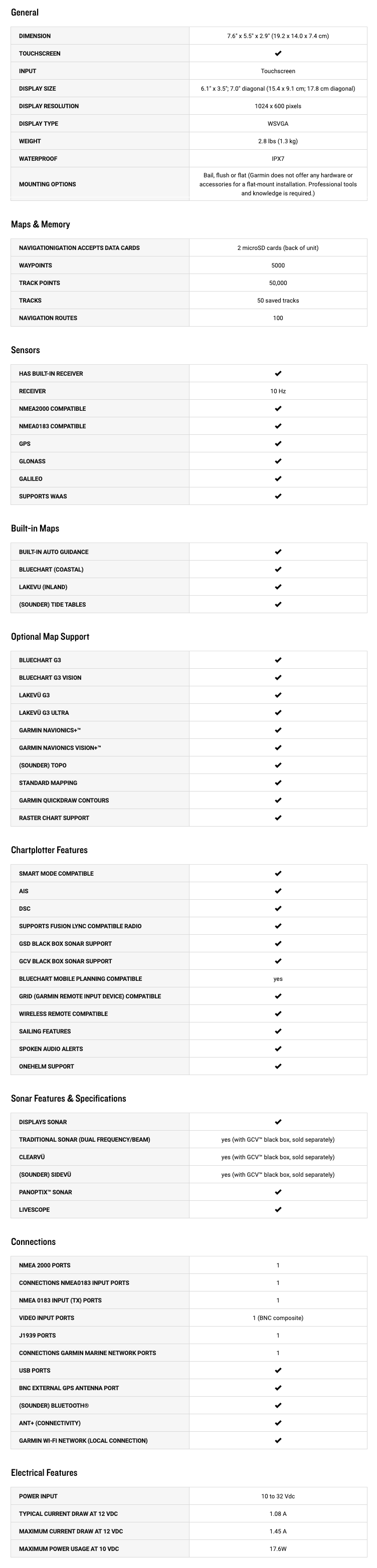 - Preloaded Mapping: Access BlueChart g3 coastal charts and LakeVü g3 inland maps with integrated Garmin and Navionics content.