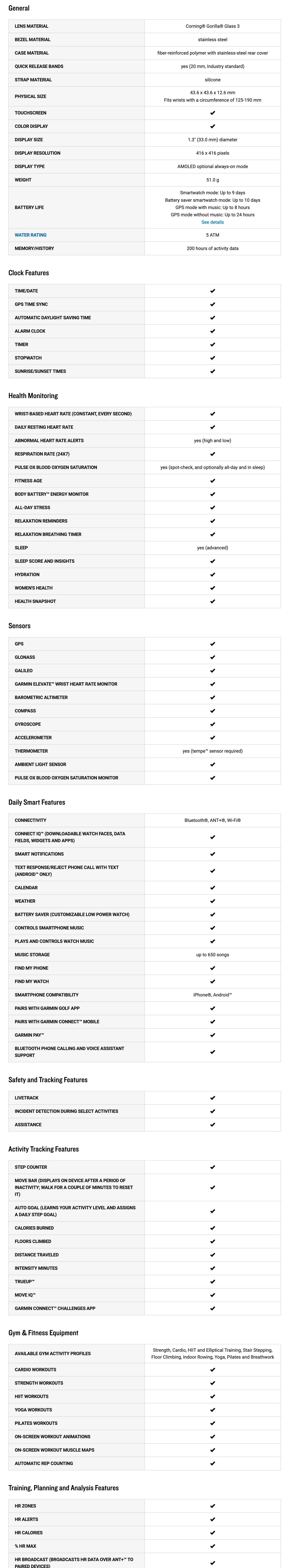 - Battery Life: Up to 9 days in smartwatch mode and 24 hours in GPS mode.