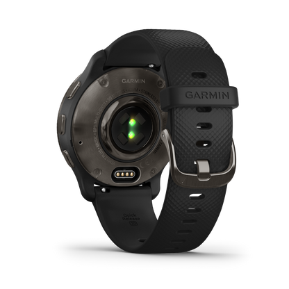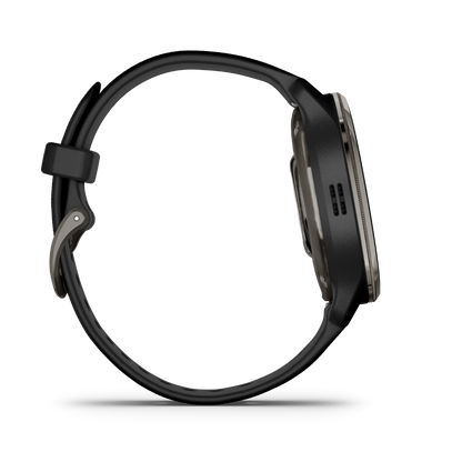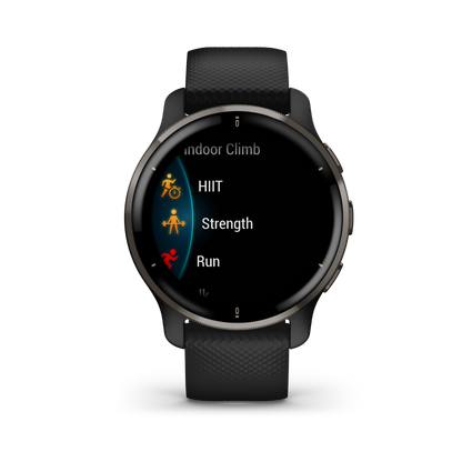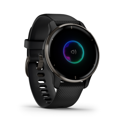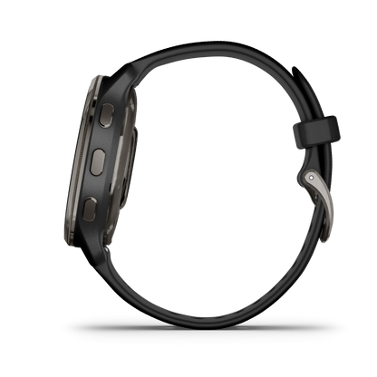 The Garmin Venu 2 Plus features a sleek design with a slate stainless steel bezel and durable black silicone band. Its elegant appearance is matched by functionality, ensuring it fits seamlessly into any lifestyle.