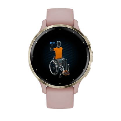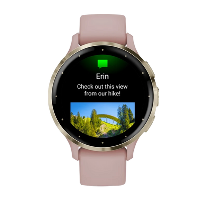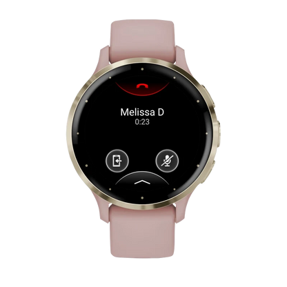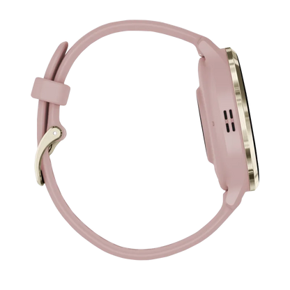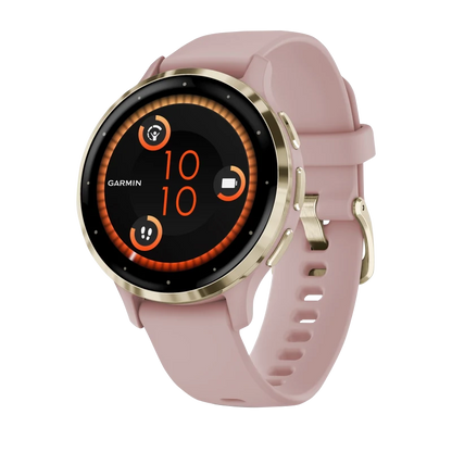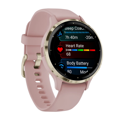 The Garmin Venu 3S boasts a sleek and elegant design, featuring a soft gold stainless steel bezel complemented by a dust rose case and a comfortable silicone band. This stylish combination ensures that you can wear it all day long, no matter the occasion.
